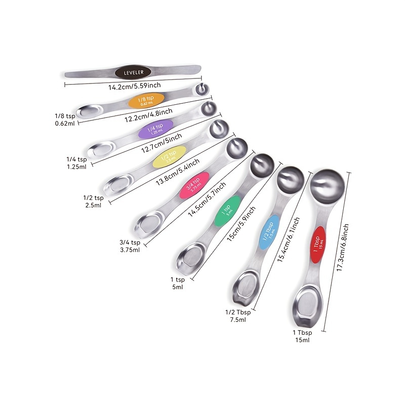 Home > Set Of 8; Magnetic Measuring Spoon Set; Double Sided Stainless Steel Measuring Spoons; Fits In Spice Jars; Stackable Teaspoons; For Measuring Dry And