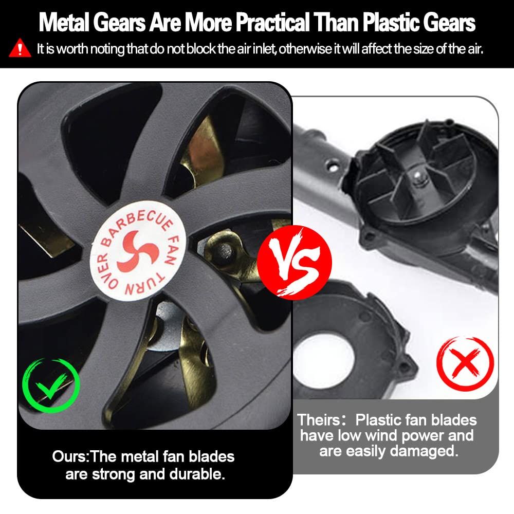 Our BBQ blower is made of plastic body and metal air outlet;  which has good impact resistance and heat resistance;  not easy to damage;  not easy to rust;  and can withstand more force. In addition;  the inside of the blower is made of high-quality stainless steel;  and the metal gears are smoother and more durable than plastic gears.