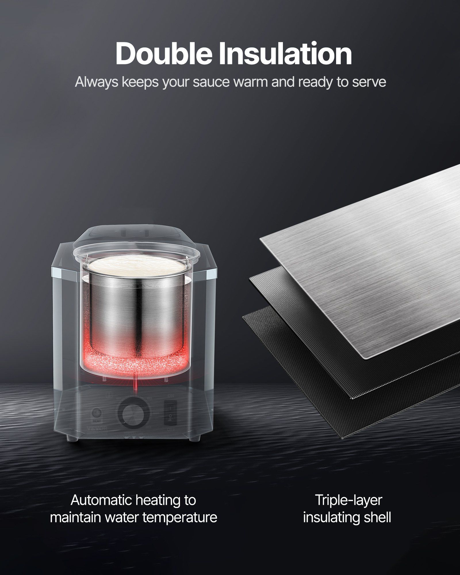 This electric cheese dispenser has a powerful motor, ensuring rapid heating to your specified temperature. With a food bowl capacity of 2.4L / 0.6 gal and a water tank that holds 3L / 0.8 gal, it keeps your sauces warm and ready for serving at all times.