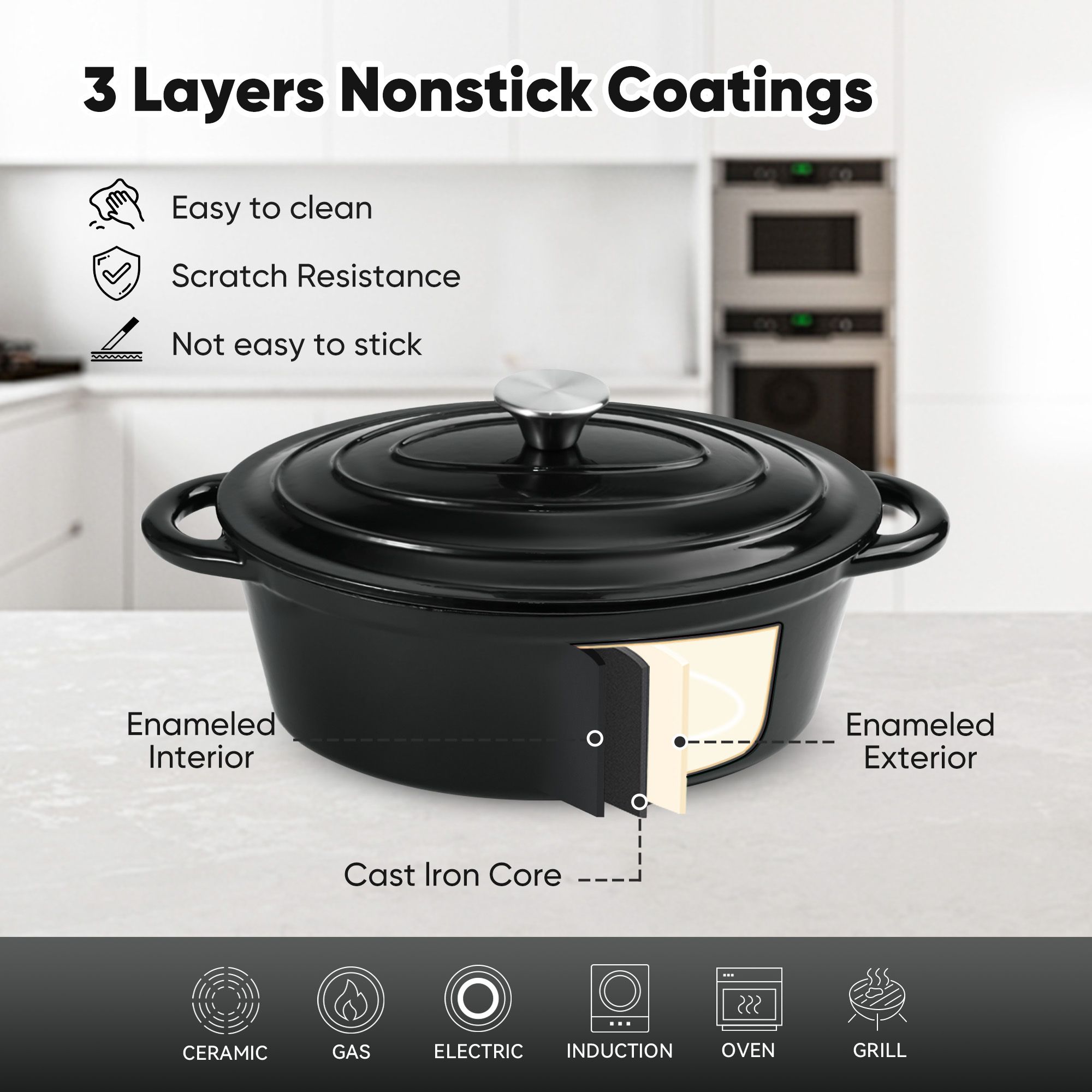 ��LARGE 4.5-QT CAPACITY: The oval dutch oven with a diameter of 11.4 inches and a capacity of 3.5 liters meets all the needs of daily stewing, don't worry about even family gatherings. It can be used in various cooking methods, such as stewing, cooking, baking, etc.The highest temperature tolerance is as high as 500°F.