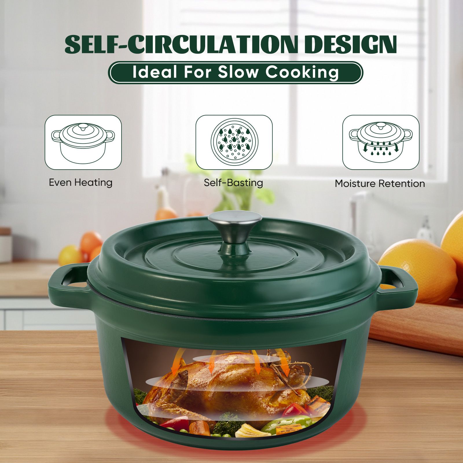 ENCLOSED THERMAL CIRCLE: This enameled dutch oven pot is design with circulating shower type lid, the raised design of the pot cover allows water vapor to circulate in the pot and locks the nutrition and moisture of the food, evenly fall on the food to maintain the original nutrition, possess pretty heat retention performance.