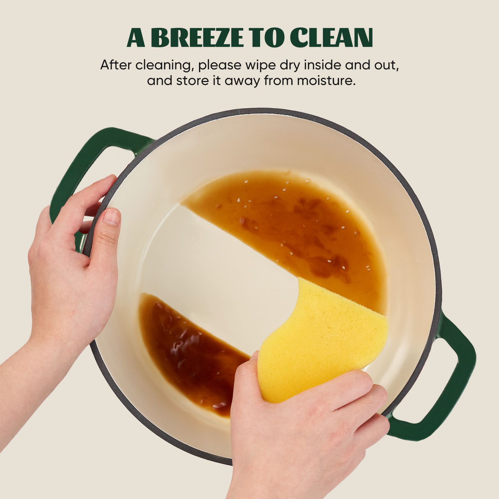 EASY TO CLEAN: This Dutch oven has a non-stick coating, it's easy to clean with soft sponge or cloth. If you want to remove difficult stains, soak in warm water for 1 to 2 hours or longer, and then use baking soda or neutral detergent to clean them off.Do not clean with a stainless-steel wire ball or other tools that may leave scratches.